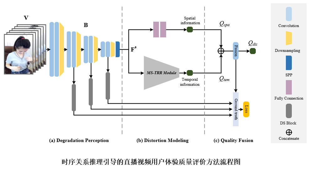 论文深入分析了直播视频与一般流视频之间的联系与区别,针对直播视频中用户反馈对于视频体验质量的重要性,提出将时序关系推理引入到直播视频的质量评价任务中来衡量失真的视频中时序关系对于用户体验质量的影响。该方法能够对视频中时域的失真进行有效的度量,并借助深度神经网络强大的特征提取能力,对直播视频的用户体验质量进行准确的预测。