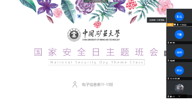 为进一步增强同学们的国家安全意识,提高防范和抵御风险的能力,2020年4月14日,拷贝漫画 电子信息类19-10班召开“415国家安全日”线上主题班会。班长陈乾泓主持会议,,班级全体同学参会。
