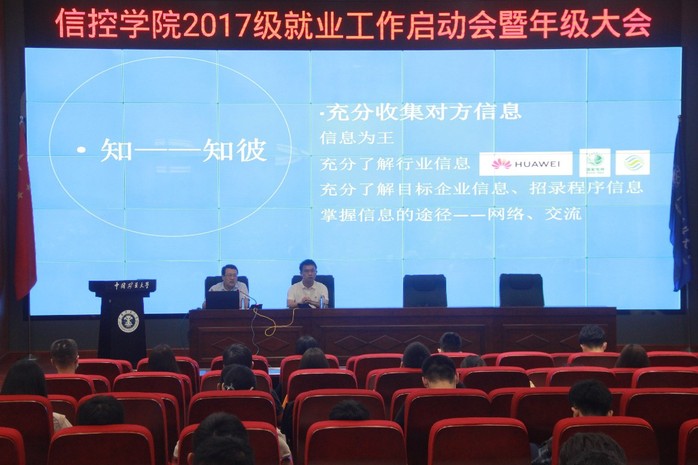在信控楼A101报告厅通过线上线下相结合的方式召开2017级就业工作启动会暨年级大会,大会邀请校就业指导中心副主任李志峰出席,2017级辅导员、院团委书记祁昊宇主持大会,2017级全体同学参与此次大会。
