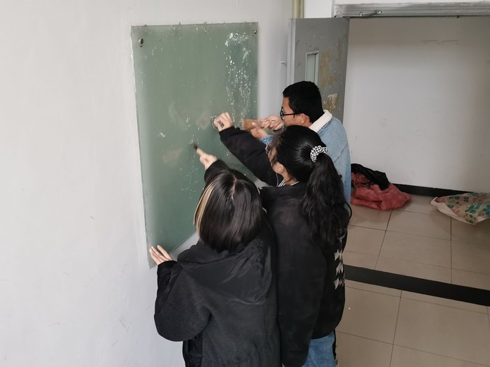 本次活动要求同学们清理松苑三号楼楼道展板上贴的广告。全班同学分为七个小组,每个小组负责一个楼层,各组同学利用铲子、除胶剂、垃圾袋等工具对楼道展板进行清理,活动中各组分工明确,井然有序。大家将广告小心撕下,用铲子细致地铲掉残留的纸片,在最困难的除胶环节,同学们集思广益,想出先用浸了热水的湿布或纸巾擦拭展板再用铲子铲掉胶水污渍的方法,有效解决了问题。在各位志愿者的共同努力下,杂乱的展板焕然一新,变得干净整洁。