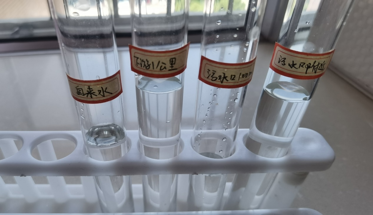 8月14日,实践团成员廖积欣和马晓斐分别在湖南湘江和山东大汶河开展社会实践活动,她们各自前往湘江和大汶河污水排放口上游100米处、污水排放口附近和污水口下游1000米处进行取水,湘江和大汶河两处水样整体清澈,没有异味。随后,两人通过试纸对样品进行PH值的检测。经过初步检测,湘江和大汶河排放口上游下游及排放口处三处水样整体PH值差异不大,都接近中性。