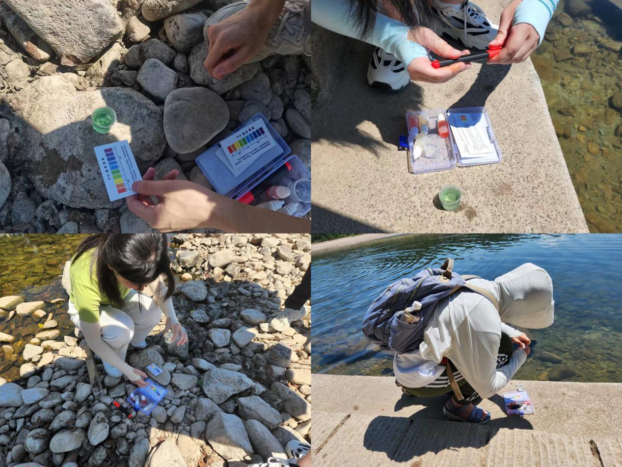 7月14日,成员钱兴扬通过与温州市环保局交流,向工作人员了解浙南一带水质情况,经过学习,深入了解到水质的相关指标并获得楠溪江六月份水质监测数据。次日上午,实践团队在昨日了解到数据的基础上前往楠溪江狮子岩大源溪中下游周边地带进行多点水质采样调查,了解周边自然环境情况。根据测试结果和实地考察得知,该地段水质清澈,无明显泥沙沉积,无明显垃圾类漂浮物,没有异味,可见蝌蚪等小型水生动物游动;水质呈弱碱性,余氯含量低,属于二类水水质。河床底部多为石块,由于夏季天气炎热水位较低,石块暴露在地表。通过考察当地居民生活状况,实践团队得知,居民可以引楠溪江水用于灌溉与生活用水,在支流边进行衣物清洗等日常活动。周围居民区河流里观察到了少量浮游植物,由此可见周围地带植被覆盖率高,生态环境良好。