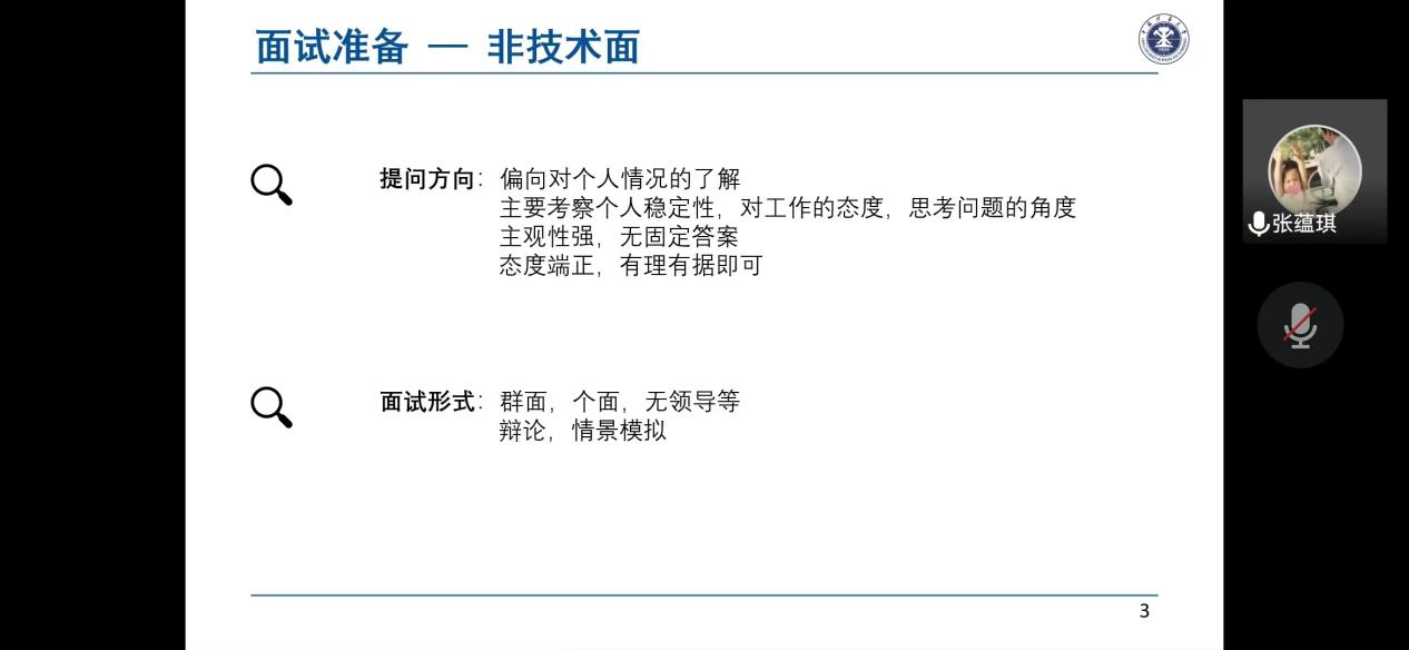 张蕴琪就技术面试和非技术面试两个方面进行介绍。他提出,技术面试中如果涉及到自身短板,要及时表达出自身的优势来弥补,遇到不会的问题,要态度谦虚诚恳。