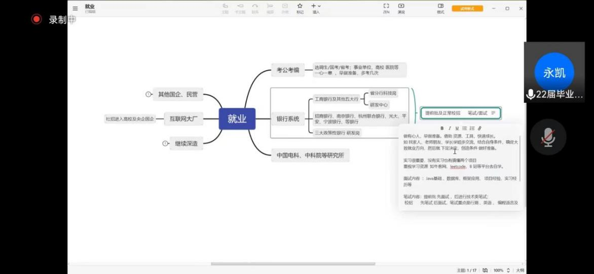 张永凯详细介绍了目前就业的几个方向,如大厂民企、考公考编、银行系统以及科研院所等。他劝诫大家要多学习,多和学长学姐交流,结合自身条件,确定大致就业方向,然后下定决心,创造条件,做好准备。