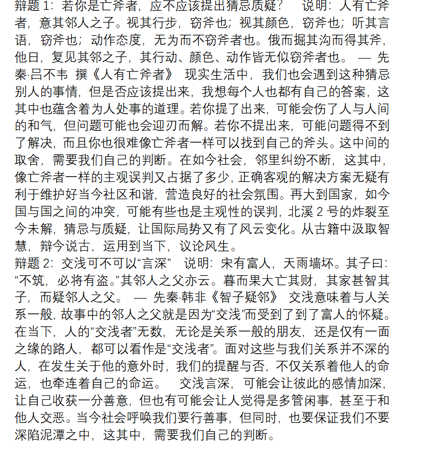活动得到了同学们的积极响应,大家于线上踊跃报名并积极加入相关活动群。参与者或从自身经验出发,深入探讨热门话题,如人工智能对就业市场的影响;或巧妙结合古文,自主创造新颖辩题,如亡斧者应不应该提出猜忌质疑。活动后期,学院学生会对征集辩题进行了审核筛选,以便为校辩论赛提供辩题。
