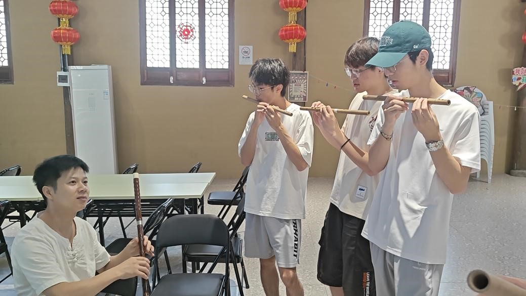 7月19日,团队成员一起来到紫荆村进行实地调研,与当地乡村经理人朱丹老师围绕中泰竹笛的历史、制作、传播等方面展开交流。随后,成员们在朱丹老师的带领下走访调研了十几家竹笛个体户,深入了解中泰竹笛的制作过程和紫荆村特色的生产经营模式。下午,团队成员参观了中泰竹笛展示馆。朱丹老师围绕“国乐悠悠”“国艺代代”“国师莘莘”“国风赫赫”四个篇章讲述了中泰竹笛的历史文化、产业发展、制作技艺、吹奏技巧等。7月20日上午,实践团在紫荆村文化大礼堂跟随当地非遗传承人鲍老师、丁老师体验中泰竹笛的制作。在丁老师的指导下,队员们学会了竹笛的吹奏方式,并有幸现场聆听大师级别的竹笛吹奏。