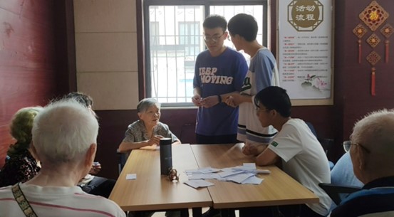 7月11日下午,团队成员抵达老年公寓与老人们交谈,并在娱乐室与他们开展轻松有趣的如“你画我猜”等小游戏,各种有趣的简笔画逗得老人们哈哈大笑。游戏之余,为提高老人们的科技使用能力,成员们详尽地介绍了微信等各种实用软件,主动教老人们如何使用智能手机进行视频通话、听音乐等操作。活动的最后,团队成员和老人们前往休息室,共同合唱了《祖国》、《母亲》等经典老歌,在歌声中重温老人们的美好回忆。