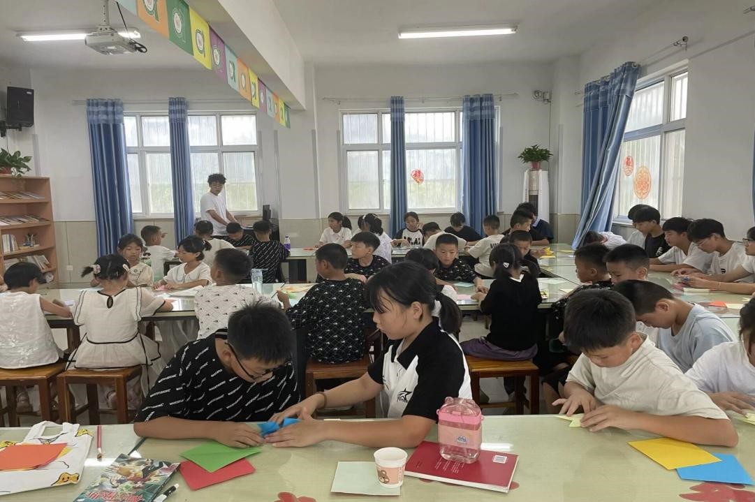 随后正式上课。首先进行的是棋类运动体验课——走进“棋”妙世界。在支教老师的带领下,孩子们围坐一堂,接触并学习了中国象棋、五子棋等棋类运动的基本规则与策略。支教老师通过生动的讲解和实战演示,让孩子们在轻松愉快的氛围中感受到了棋类运动的魅力,不仅锻炼了他们的逻辑思维和判断能力,也激发了他们对传统文化的兴趣与热爱。在讲解完成后,课堂进入了实践部分,孩子们积极与周围的朋友或者支教老师对弈,既锻炼了逻辑思维能力,又进一步加强了孩子们之间的情谊。紧接着,手工折纸课更是将活动推向了高潮。支教团的老师们用普通的彩纸创造出形态各异的作品,在他们的耐心指导下,孩子们在动手实践中不仅锻炼了手眼协调能力,更激发了无限的创造力和想象力,脸上都洋溢着满满的成就感与喜悦。课后大家一起将折的纸飞机放飞,漫天纸飞机飞舞,如同孩子们的未来一样迎风飞翔。