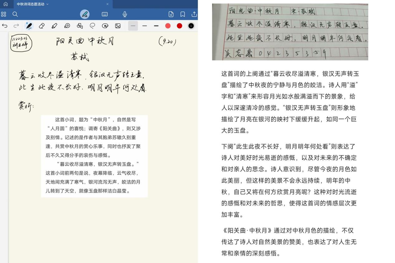 本次活动得到了同学们的积极响应。参与者们以中秋佳节为主题,通过搜集古诗词进行手写抄录并附上个人文字赏析,进行不少于七天的上传打卡。中秋佳节,以诗会友,赏诗悟情,同学们的作品内容充实,富有创造力,用诗词传递对传统文化的热爱与敬意。