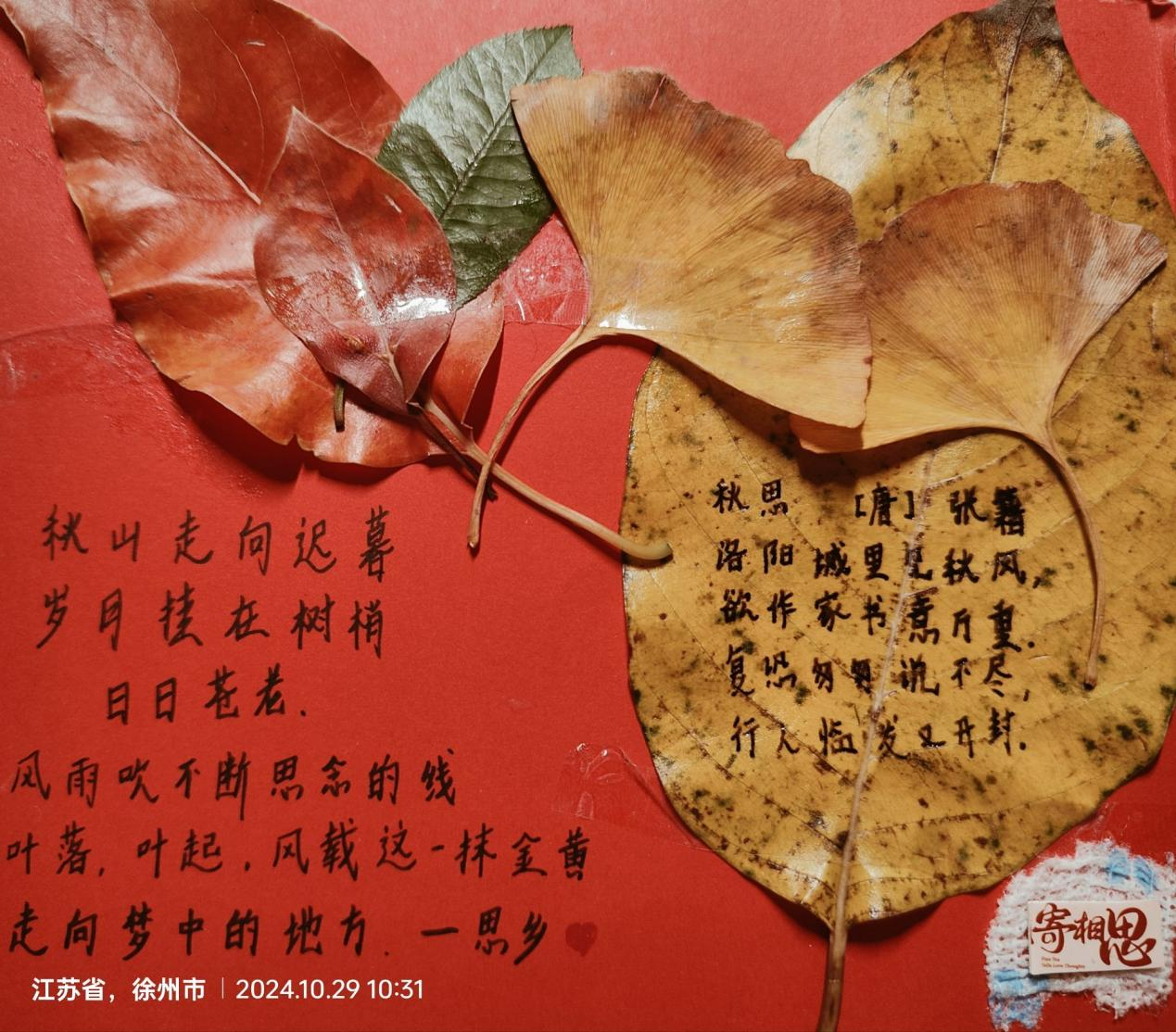 活动得到了同学们的积极响应。参与者们在学校的各个角落拾取落叶,有的同学在树叶上留下自己的诗句或情感表达,为每一片树叶赋予了独特的生命和意义;有的同学则将捡拾的树叶拼凑成图案,利用不同色彩和形状的树叶进行艺术创作,充分展现了大家的创造力和想象力。活动结束后,工作人员对参赛作品进行了认真评选,评选出了一批优秀作品。主办方还通过QQ群分享了优秀作品,让同学们交流鉴赏,共同感受秋叶的魅力和创意的无限可能。