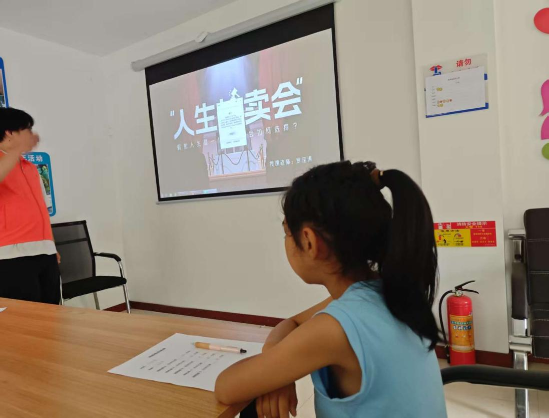 7月23日,实践团队为6名儿童进行课业辅导。团队针对6名儿童开展语数外三科辅导,涵盖拼音教读、思维启发、英语读写等内容,通过听写训练、计时练习等方式巩固知识。在课业辅导结束后,成员为小朋友们准备了海洋生物科普课,运用多媒体带领小朋友们遨游海底世界,认识形态各异的海洋生命。课程巧妙融入环保主题,教导小朋友们爱护环境。此外,实践团队还展开了一场“人生拍卖会”主题课,分发给小朋友们一些虚拟资金,让他们在“家庭温暖”“知识财富”“诚信美德”“个人权力”等主题中选择,让小朋友们明白精神世界的重要性。