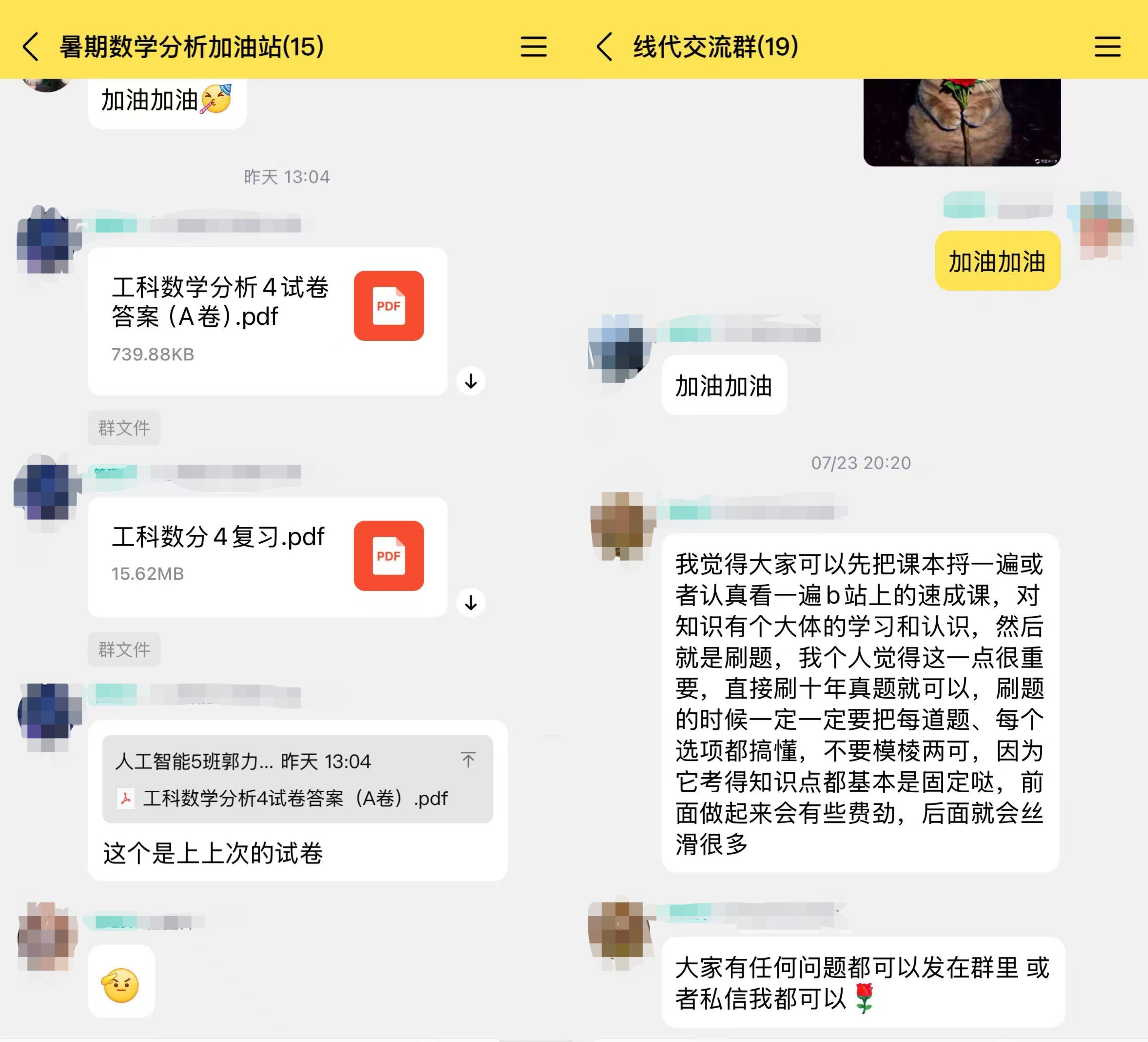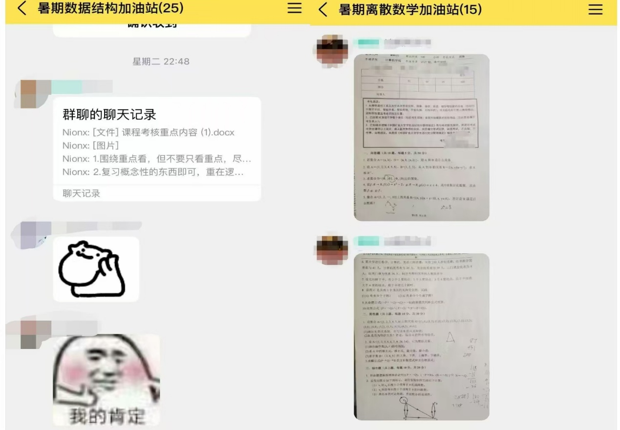 本次活动针对数学分析、线性代数、数据结构与算法、离散数学等重点课程,利用线上的专属答疑群搭建了一个便于学院朋辈间互相交流与学习的平台,并邀请对应各学科的高分同学在群内进行知识答疑、分享学习经验。暑期答疑过程中,学业优秀的同学主动承担知识梳理任务,针对典型例题进行分步讲解,并且分享了笔记整理、复习规划等实用方法。参与学生表示,这种互助模式既帮助他们扫清了课程知识盲点,还让他们感受到了集体学习的温暖。