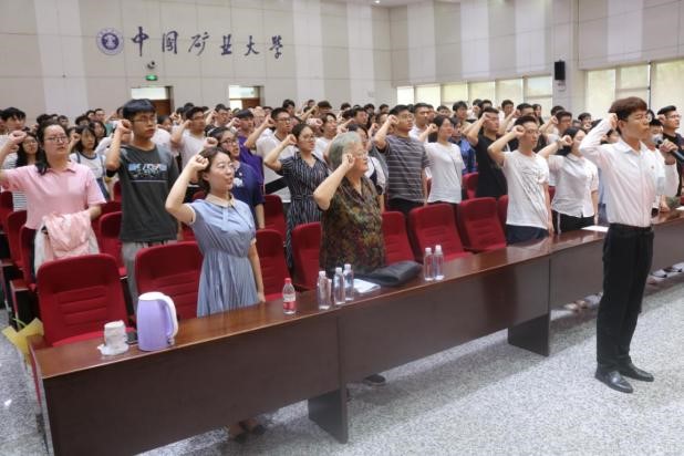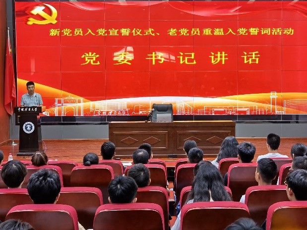 新党员入党宣誓仪式和老党员重温入党誓词活动在庄严的《国际歌》中开始。在学生党员李澳一的带领下,新老党员面向鲜红的党旗,举起右拳庄严宣誓,铿锵有力的誓言蕴含着坚定的共产主义理想信念和为共产主义奋斗终身的强烈志愿。