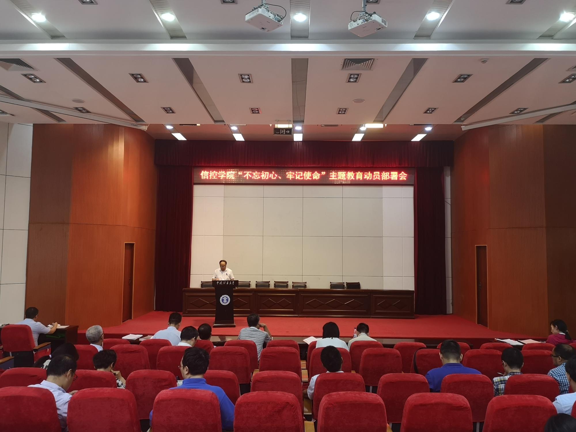 实际情况从四个方面进行了解读和动员部署。一是充分认识开展“不忘初心、牢记使命”主题教育的重大意义。他强调本次主题教育是以习近平同志为核心的党中央做出的重大部署,广大党员同志迫切需要以新时代中国特色社会主义思想武装头脑,使党的十九大确定的目标任务落地生根。通过主题教育,学院全体党员干部要发扬革命传统和优良作风,精神足、敢担当,把“初心和使命”落实在贯彻学校第十四次党代会精神、实现学校创新发展、持续奋斗的“三步走”新征程中来。二是深刻领会“不忘初心、牢记使命”主题教育的总体要求、基本原则和着力重点。全面把握“守初心、担使命、找差距、抓落实”,把“学”和“做”紧密结合,把“查”和“改”贯穿始终,作为学院老师应当紧紧围绕为党育人、为国育才,紧扣立德树人的根本任务,推动“三全育人”工作的实际成效。三是准确把握“不忘初心、牢记使命”主题教育的工作安排。要狠抓落实学院领导班子和处级领导干部主题学习教育、调查研究、检视问题、整改落实和成效评估;要按照学校未来五年的总体思路、三大战略和九大任务,积极开展“融合信息技术、创新智慧育人”教育部“三全育人”试点学院建设;要做实做牢基层党支部学习教育和检视整改,发挥百佳研究生样板党支部的典型示范作用,辐射带动基层党建工作开展,推动基层党支部全面进步、全面过硬。四是加强组织领导,确保“不忘初心、牢记使命”主题教育取得实效。为开展好“不忘初心、牢记使命”主题教育,学院党委、各支部首先要高度重视,精心组织,扎实推进。学院党委书记要带头学、带着改、带头抓,切实担负第一责任人责任。学院成立了“不忘初心、牢记使命”主题教育领导小组,对学院主题教育进行统一领导和组织实施。在开展主题教育过程中,既要认真落实中央统一部署,把“规定动作”做到位,确保主题教育总要求、总目标得到实现;同时要结合学院实际,把主题教育与推动中心工作紧密结合,同谋划、同部署、同落实、同考核,坚决防止“两张皮”,切实在主题教育开展的过程中,促进学院正在进行的各项工作更加有力、更好地开展。