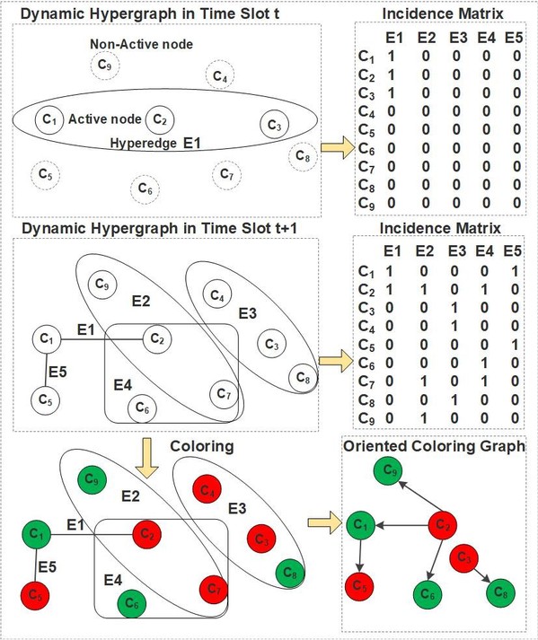 论文介绍了基于超图理论解决社交物联网场景中面向动态网络拓扑结构的无人机预警信息传播问题的最新研究成果。首先,在社交物联网场景中,无人机作为簇头可以将预警信息优先扩散给那些社交中心度较高的簇内地面用户,这些用户收到信息后可以作为新的簇头,进一步将预警信息扩散给社交关系相近的用户。由于地面用户的高速移动性以及角色多变性,网络拓扑结构及簇结构随之动态变化,从而使结构变化前的资源分配方案失效。图论作为离散数学的分支,是设计和分析复杂网络结构的最基本且强有力的数学工具。超图作为传统图模型的广义形式,可以准确地对应急通信场景下信息扩散时的用户状态以及频谱分配时的互干扰关系定量描述。因此,论文将动态变化的网络拓扑及簇结构抽象为动态演进超图(无人机或地面用户担任簇头的多播传输簇抽象为点,干扰关系抽象为超边),从而用超边的插入与删除表示网络拓扑变化引起的干扰关系演变。基于此,论文将动态频谱资源分配问题转化为动态超图着色问题。针对超图结构在连续时隙中演化使之前的着色策略失效的问题,论文给出了一种基于颜色扩散的同态超图染色方案,实现了预警信息扩散速度、信道切换损耗及计算复杂度之间的折中。