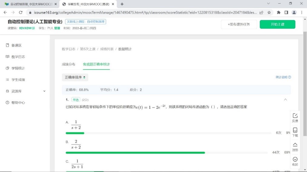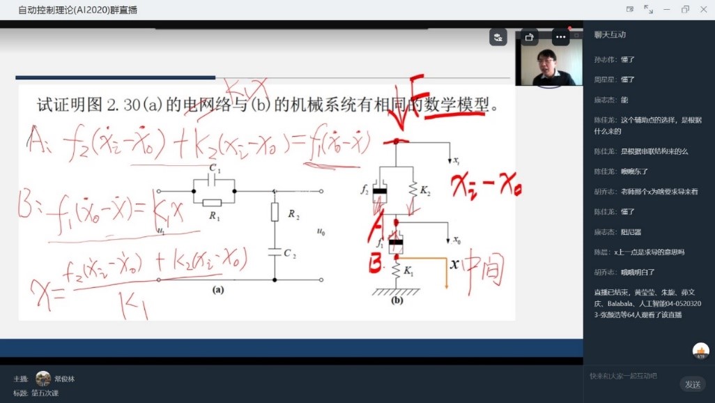 人工智能专业2020级《自动控制理论》的教学任务。《自动控制理论》是一门理论性强、对数学、电路基础要求较高的课程。学生普遍反应数学基础、电路基础偏弱,对课程的学习存在畏惧心理。为保质保量地完成线上教学任务,任课老师在教学内容、教学方式上进行了精心设计。在教学内容上,通过“以德筑教-以识筑学-以践筑创-以竞筑力-教研共生”五位一体的教学理念,将价值塑造、知识传授和能力培养有机融合,提高课程的创新性、高阶性、挑战度和兴趣度;在教学方式上,通过”钉钉直播+慕课堂+SPOC线上课程“的方式,开展以学生为中心的混合式教学。在教学过程中利用手写板圈点重要内容,板书公式推导,吸引学生的注意力;通过慕课堂推送随堂练习题、讨论题,激发学生的学习主动性;在课后,通过钉钉发布书面作业,学生完成后拍照上传,任课教师及时批改评阅,学生更正错题后再次交流评价,巩固学生对知识的理解,提高学生解决问题的能力。
