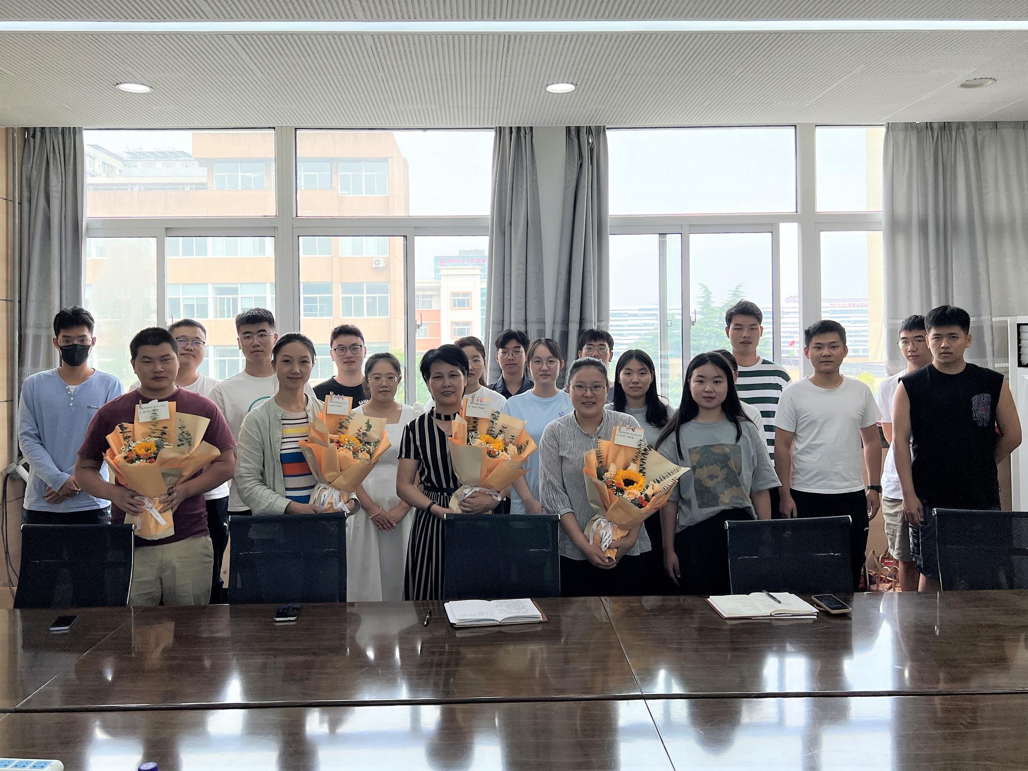 在文昌校区,梁娜老师在教四楼400会议室与2022级研究生新生骨干座谈,就学生骨干的作用发挥进行深入阐释,并为学生送去中秋的月饼和祝福;辅导员老师再次强调假期注意个人安全,梳理疫情防控相关要求。会上,同学代表也为老师献花,送上教师节的节日祝福。