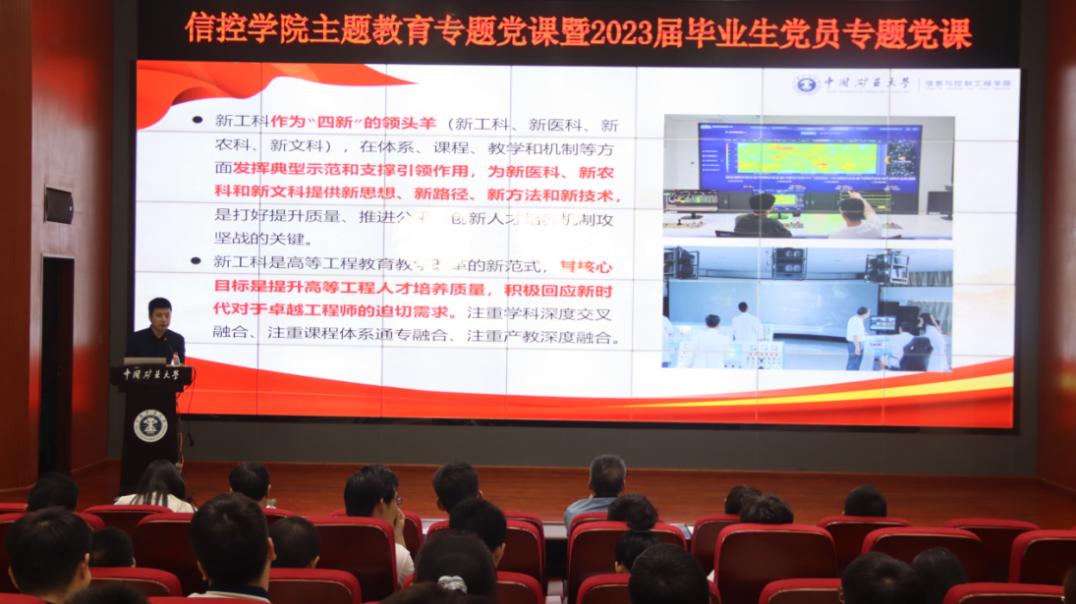 程德强书记从“以党为纲,落实二十大精神”“以人为本,全面推进人才培养”“以身作则,发挥党员模范作用”“以梦为马,扛起民族复兴使命”四个方面进行了讲授。他强调,党员是学院事业发展的中坚力量,师生党员要按照主题教育“学思想、强党性、重实践、建新功”的总体要求,加强党的创新理论武装,学深悟透习近平新时代中国特色社会主义思想,深刻领会教育、科技、人才是全面建设社会主义现代化国家的基础性、战略性支撑的重要论断,在以学铸魂、以学增智、以学正风、以学促干方面取得实实在在的成效。他指出教职工党员要坚定理想信念,发挥新工科学科优势,以学生为中心深化教育教学综合改革,落实立德树人根本任务,培养担当民族复兴大任的时代新人,为我校能源资源特色世界一流大学建设贡献力量。他号召毕业生党员以党的二十大精神为指引,身体力行理解高水平科技自立自强的深刻内涵和实践理论,以更加强烈的历史主动精神践行时代担当,将所学理论知识创造性转化、创新性发展为强大生产力,为中国式现代化提供青春动能。