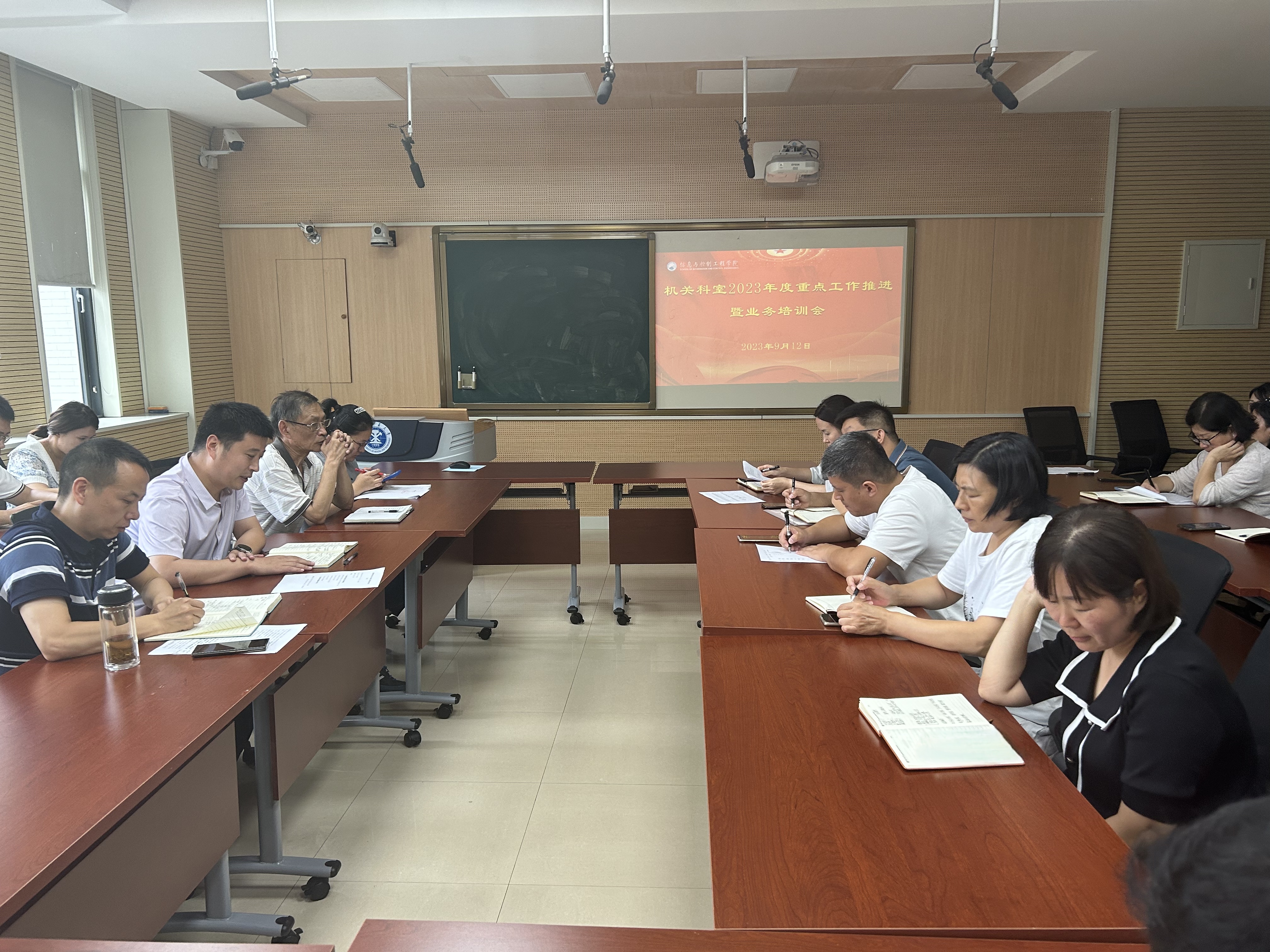 在A317会议室召开机关科室2023年度重点工作推进暨业务培训会。院党委书记程德强、副院长陈平,学院机关各科室人员参加会议。会议由陈平主持。