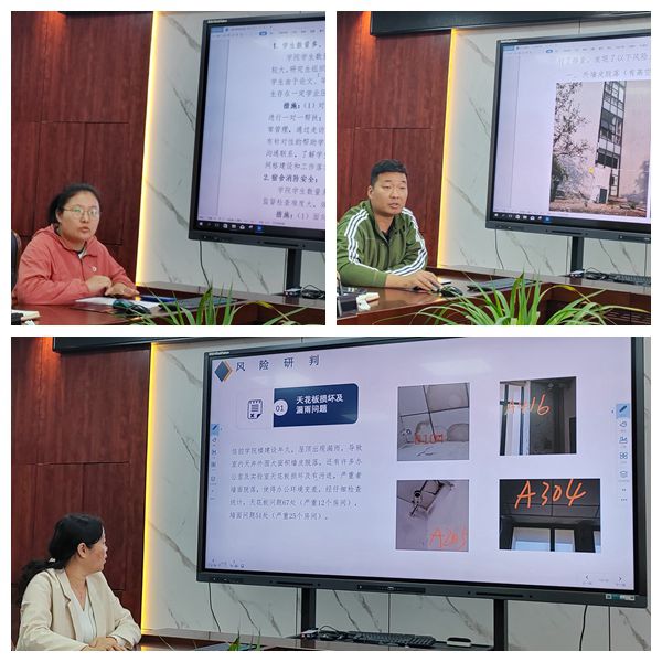 学院实验中心主任张晓春、党政办公室主任余智超、学生工作办公室主任管钰分别了汇报了前期相关工作的推进落实情况,分析了学院办公室与实验室漏水漏雨、公共区域地表沉降、师生交通安全、心理健康等方面存在的安全风险,并提出了相应的工作思路和方案。