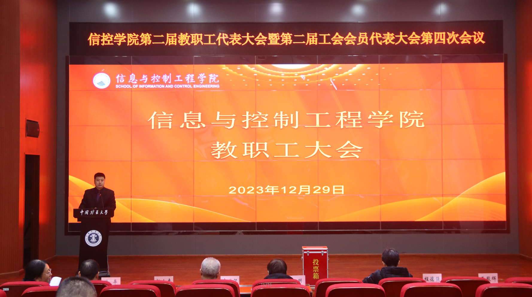 在A101报告厅召开第二届教职工代表大会第四次会议暨第二届工会会员代表大会第四次会议。学院党委书记程德强,院长王雪松,党委副书记翟文艳,副院长李世银、刘海、陈平,人工智能研究院院长王殿辉、副院长代伟,物联网研究中心副主任赵小虎、行政副主任查振高,领雁辅导员葛如峰、梁娜,学院教授委员会主任李明出席会议,教代会正式代表、列席代表、特邀代表和全体教职工参加会议。会议由翟文艳主持。