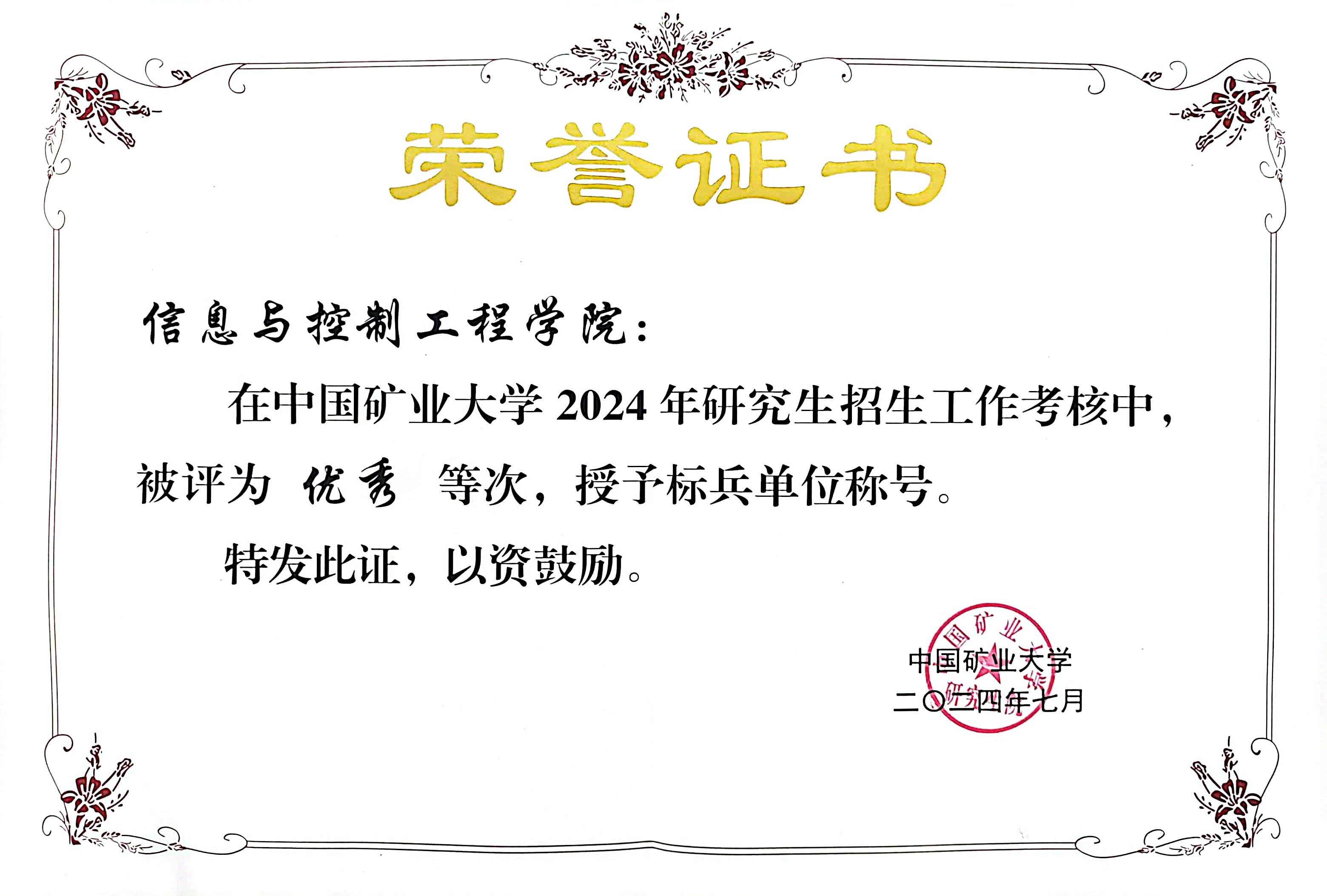 认真落实学校研究生招生工作要求和相关会议文件精神,严格规范招生工作程序和要求,通过全院教职工共同努力,圆满完成了2024年研究生招生工作任务,并有序启动2025年学院研究生招生工作。学院获评学校2024年研究生招生工作考核优秀等次,并被授予标兵单位荣誉称号。