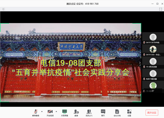电子信息类19-8团支部通过腾讯会议平台在线举行“五育并举抗疫情”寒假实践交流班会。本次班会由8班团支书赵棁宏主持,8班全体同学参加。