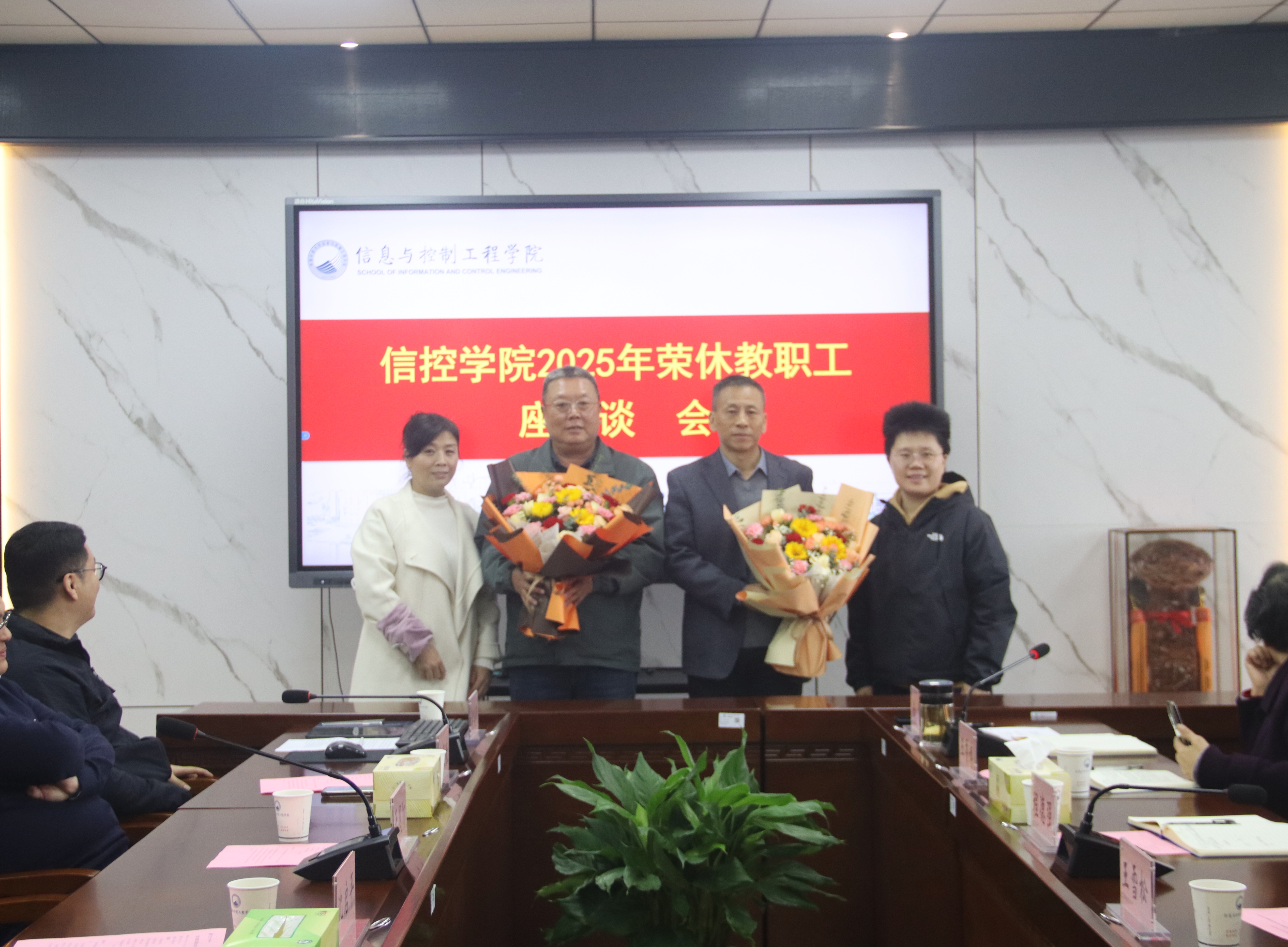 程德强和王雪松向两位荣休教职工颁发了荣休证书,电子信息党支部书记郭星歌、机关党支部书记李鸣轩分别介绍了两位老师在学校和学院的工作情况,教师代表向荣休教职工敬献了鲜花。