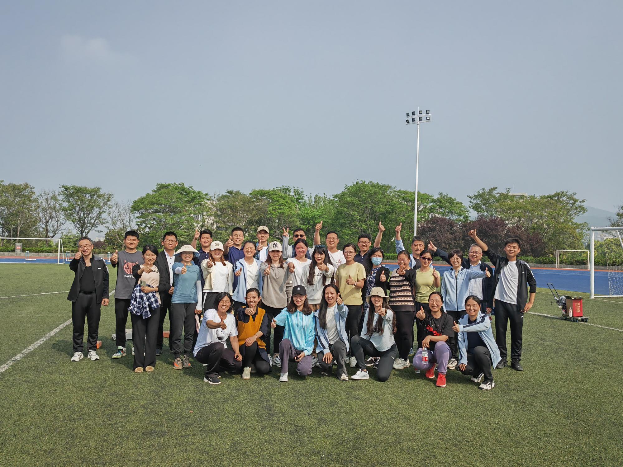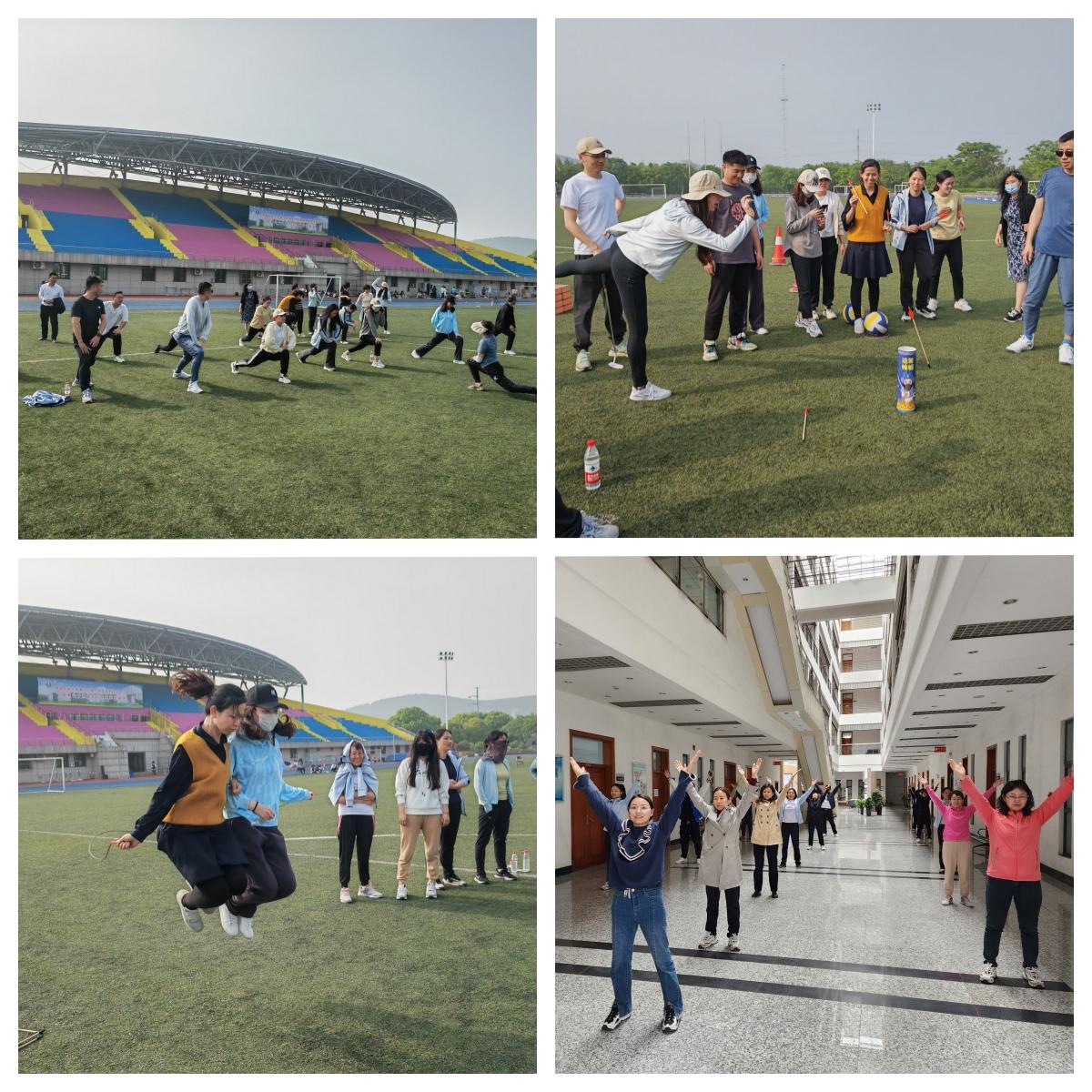 活动中,学院工会组织教职工们在进行充分热身后,练习了集体趣味比赛项目摸石过河、前呼后应、跳动节拍、环环相扣和你追我赶等项目,学院教职工们积极参与,热情高涨,配合默契,笑声、呐喊声回荡在春日校园的晴空中。在趣味比赛项目练习结束后,还进行了部分田赛和径赛的热身活动,为即将到来的运动会做好充足准备。